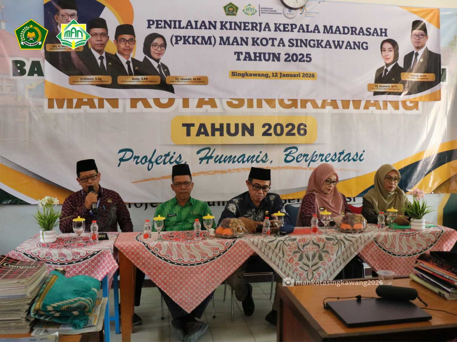 Penilaian Kinerja Kepala Madrasah (PKKM) MAN Kota Singkawang Tahun 2025 dilaksanakan pada Senin, 12 Januari 2026, bertempat di ruang guru MAN Kota Singkawang. Kegiatan ini dihadiri oleh para pengawas madrasah Kementerian Agama Kota Singkawang, yakni Idawati, M.Pd, Ehwan, S.Ag, dan Andy, S.Pd. Acara pembukaan diawali dengan pembacaan ayat suci Al-Qur’an oleh salah satu guru sebagai bentuk ikhtiar dan doa agar kegiatan berjalan lancar dan penuh keberkahan.