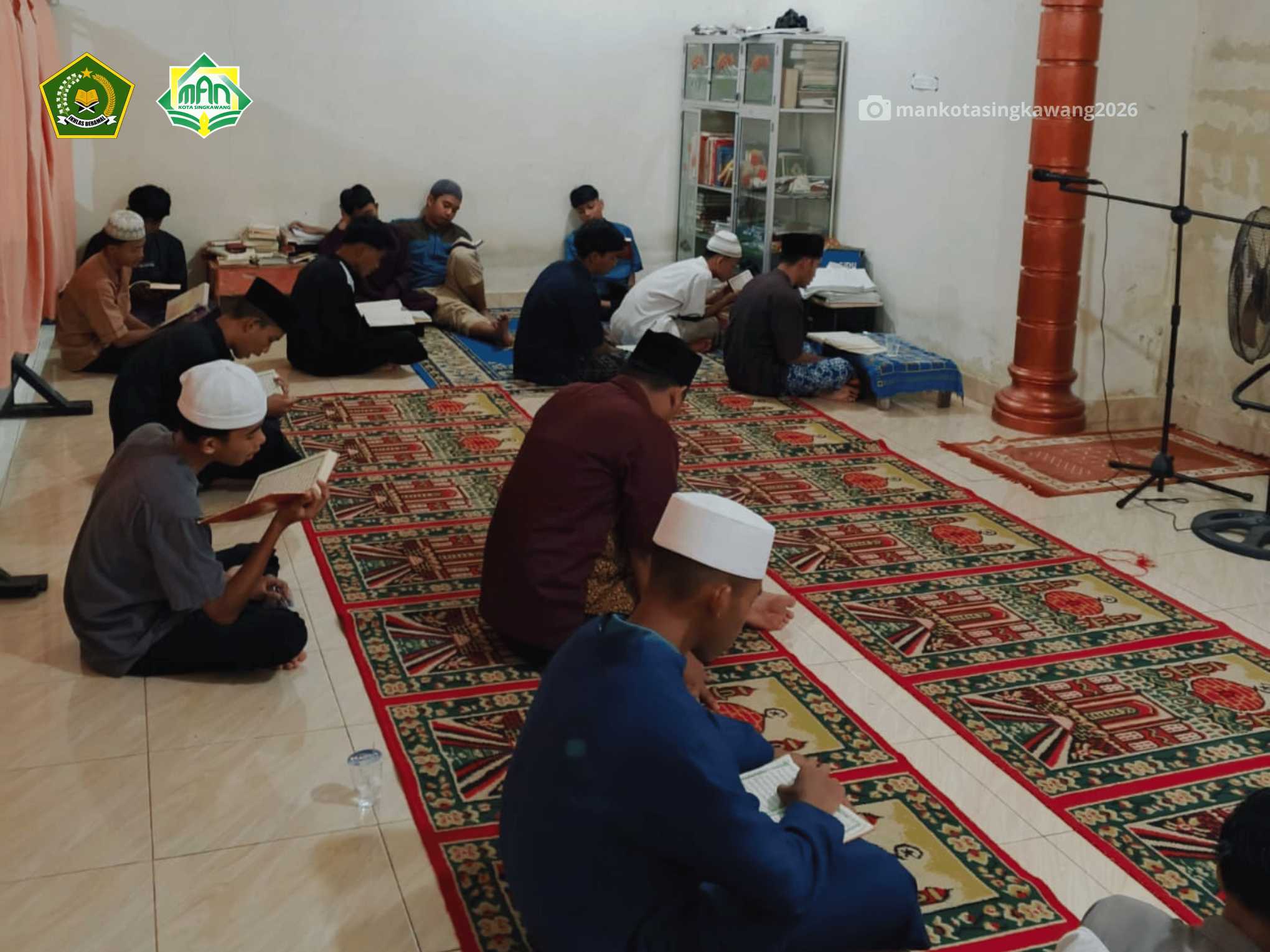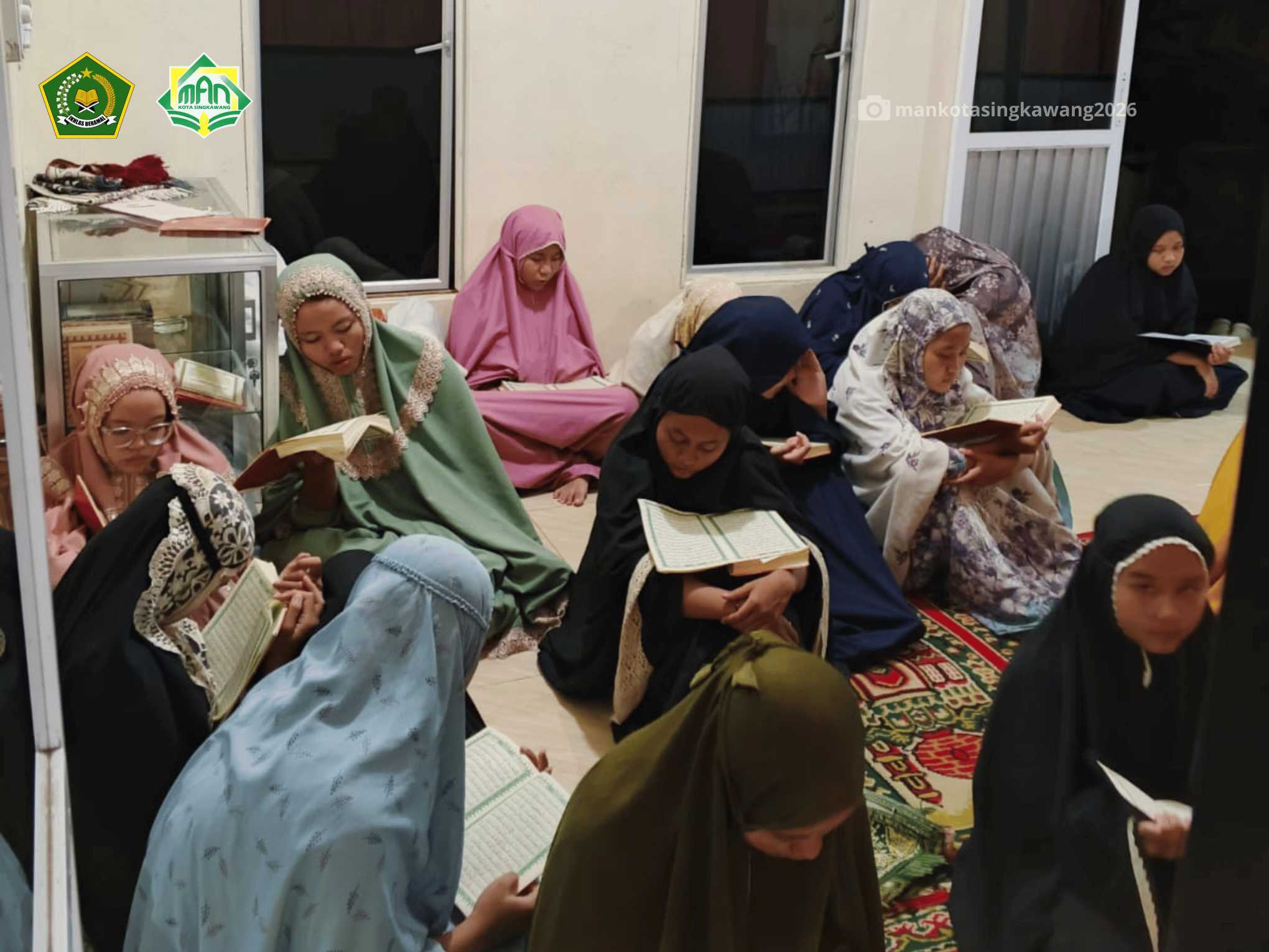 Kegiatan tilawah Al-Qur’an menjadi rutinitas penuh keberkahan bagi para santri dan santriwati asrama MAN Kota Singkawang. Usai melaksanakan sholat Isya dan Tarawih berjamaah di masjid, para santri tidak langsung beristirahat, melainkan melanjutkan malam dengan membaca dan mentadabburi ayat-ayat suci Al-Qur’an secara bersama-sama. Suasana khusyuk dan penuh ketenangan menyelimuti masjid, menghadirkan nuansa religius yang semakin memperkuat karakter spiritual para peserta didik.