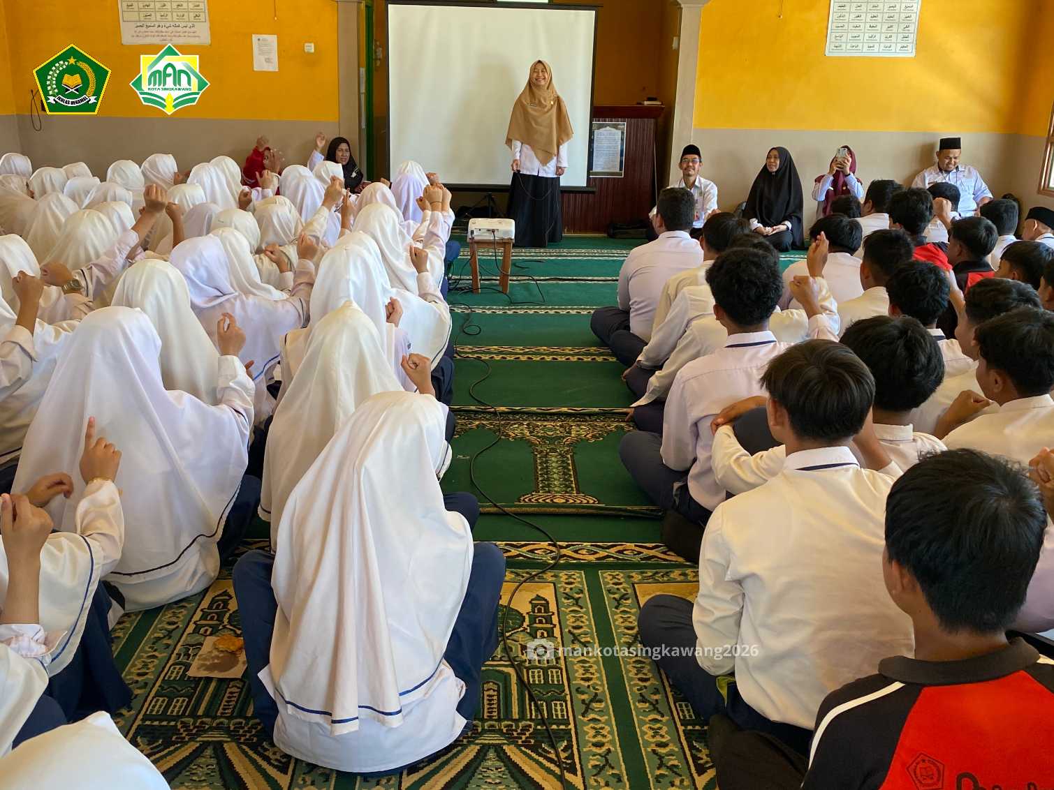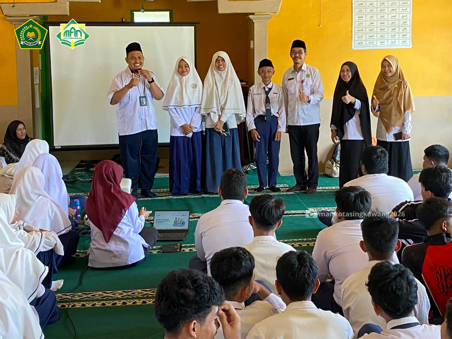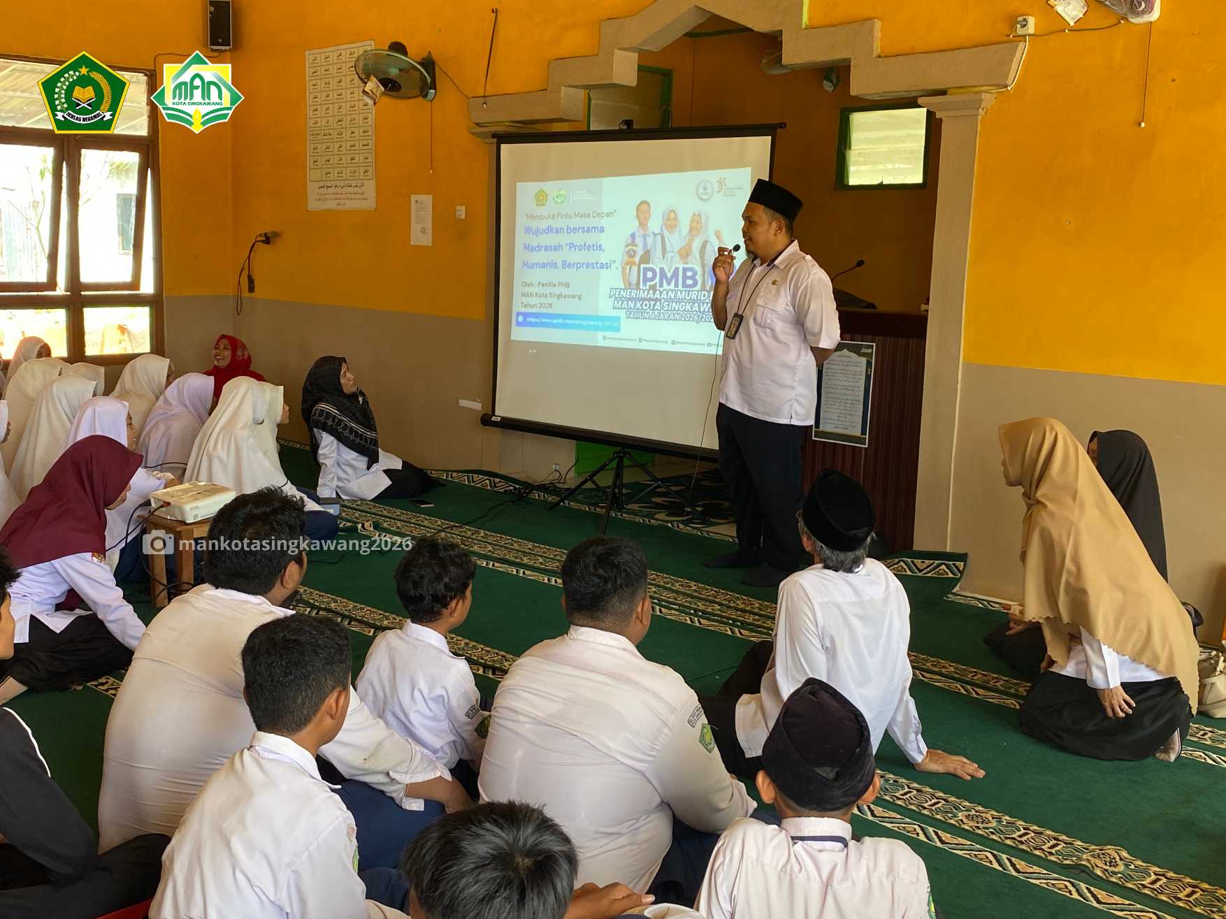 Sosialisasi berlangsung di masjid MTs Negeri Singkawang dengan suasana yang nyaman dan kondusif. Ketua PMB, Rian Nazaruddin, M.Pd., menyampaikan presentasi mengenai alur dan proses pendaftaran hingga tahapan seleksi masuk MAN Kota Singkawang secara jelas dan informatif. Penjelasan tersebut memberikan gambaran yang komprehensif bagi para siswa yang berminat melanjutkan pendidikan ke jenjang madrasah aliyah.