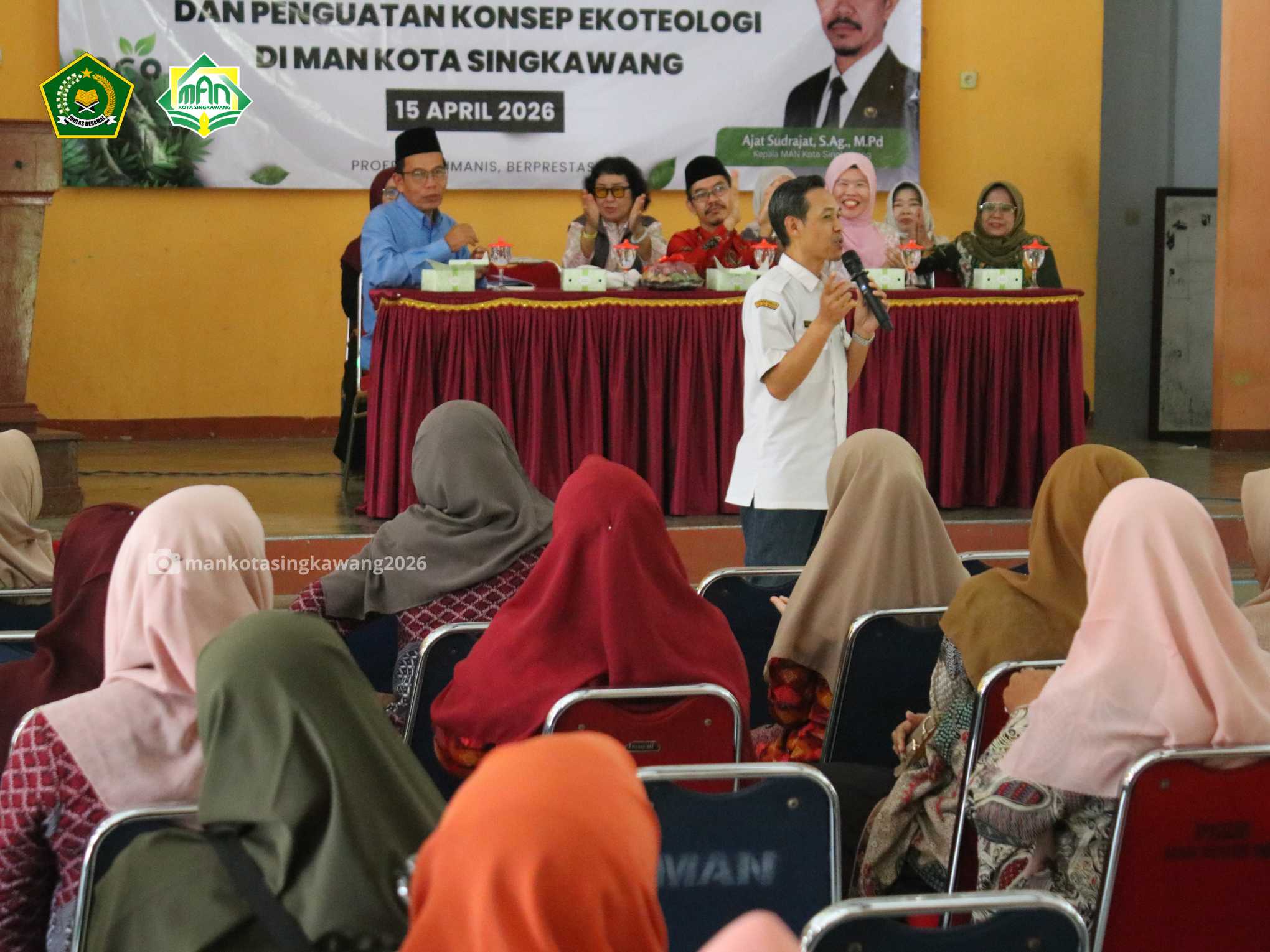 Semangat pelestarian lingkungan kini merambah dunia pendidikan melalui sentuhan spiritual. Pada Rabu, 15 April 2026, di Aula PSBB dimulainya langkah besar MAN Kota Singkawang menuju Madrasah Adiwiyata. Program pembinaan ini menghadirkan narasumber ahli, Bapak Irfan Khaerawan beserta tim dari Dinas Lingkungan Hidup dan Kehutanan (DLHK) Provinsi Kalimantan Barat. Fokus utama kegiatan ini adalah mengintegrasikan konsep Ekoteologi, sebuah pendekatan yang menyelaraskan nilai-nilai ketuhanan dengan tanggung jawab menjaga alam, guna menciptakan ekosistem madrasah yang hijau dan berkelanjutan.